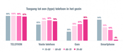 Ouder dan 75 neemt met de persoonlijke mobiliteit ook het gebruik van het mobiel internet af. Het zijn eerder witte merels of nog slechts 4% die nog een smartphone of tablet in huis haalden. Maar dat deze oudste groep daarom helemaal afgesneden is van de digitale wereld kan je niet stellen. Om en bij de 60% van hen heeft nog een computer en internet in huis.